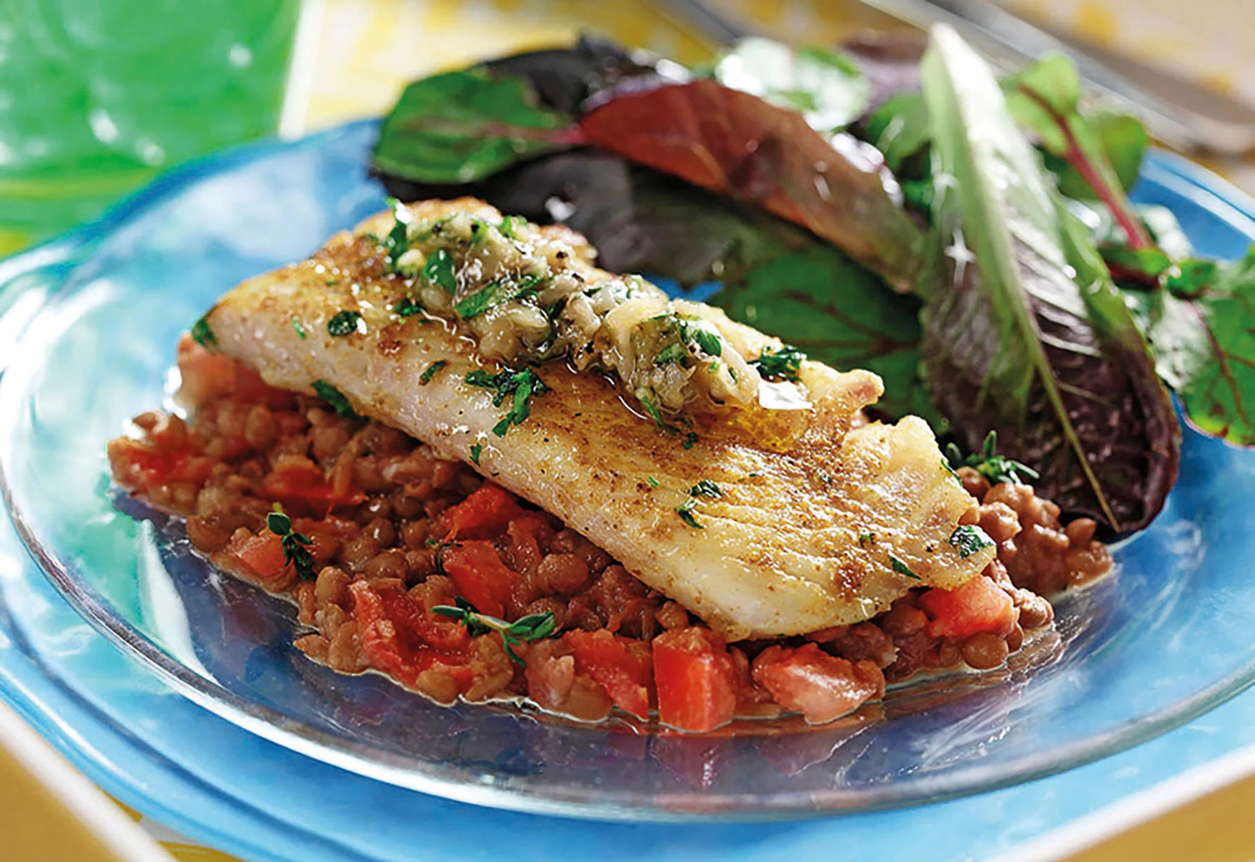 6. Spoon lentil mixture into shallow bowl and top with fish fillets.